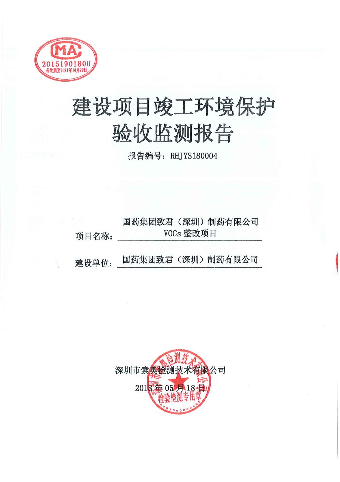 國藥致君VOCs整改項目驗收監(jiān)測報告
